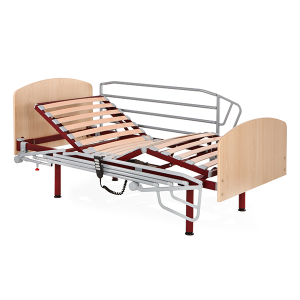 Cama eléctrica para el cuidado de usuarios bariátricos.- Lecho partido en dos mitades para facilitar su transporte y montaje, compuesto de 4 planos y 3 articulaciones, en malla electro-soldada. Ver más -