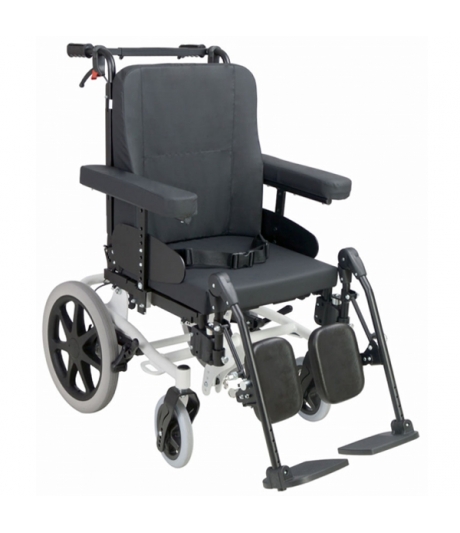 Equipado con ruedas traseras macizas de Ø300mm (otras opciones disponibles) y ruedas delanteras macizas de Ø200mm. Frenos de aparcamiento y del acompañante. Reposabrazos en forma de T, ajustables en altura y profundidad con el cojín Comfort. Reposapiés elevables con apertura lateral y ajuste de profundidad (50mm). Ruedas antivuelco ajustables y desmontables. Reposacabezas en forma de U, ajustables en altura, ángulo y profundidad.