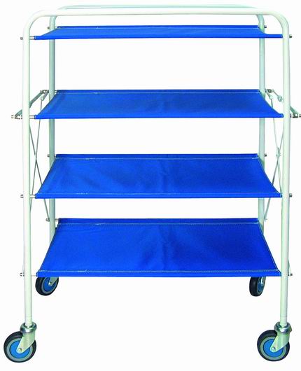 Carro plegable de hierro, pintado epoxi, color blanco, 4 bandejas de lona azul, ruedas 100 Ø. MEDIDA (cm): 83 x 51 x 114