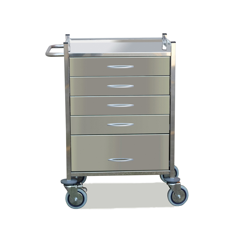 Carro de urgencias en acero inoxidable con cinco cajones para depositar todo tipo de material - Fabricado en acero inoxidable - Plano superior con reborde en tres lados - Cinco cajones - Ruedas giratorias de 125 mm, dos con freno - Protección antichoques